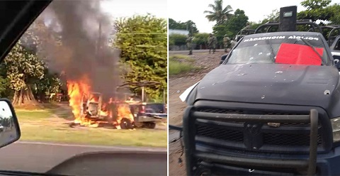 Según versiones de la prensa local, los policías estatales fueron emboscados en la mañana por hombres a bordo de camionetas blindadas, quienes también habrían incendiado varias patrullas.