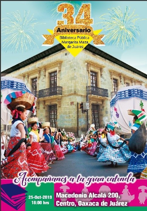 Oaxaca, Oaxaca, Sábado 19 de Octubre, 2019 (Fuente: Comunicado).- Un espacio emblemático por los servicios de información que brinda a las y los oaxaqueños, es la Biblioteca Pública Central (BPC) “Margarita Maza de Juárez”, que este año cumple su 34 aniversario y para festejarlo realizará una tradicional calenda el viernes 25 de octubre, que recorrerá diversas calles del Centro Histórico de la ciudad de Oaxaca.