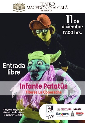 Oaxaca, Oaxaca, Lunes 09 de Diciembre, 2019 (Fuente: Agencias).- Infante Patatús de Títeres La Coperacha llega al Teatro Macedonio Alcalá el próximo miércoles 11 de diciembre a las 17 horas, entrada libre. El majestuoso inmueble se ubica sobre la avenida Independencia, en el Centro Histórico de esta capital.