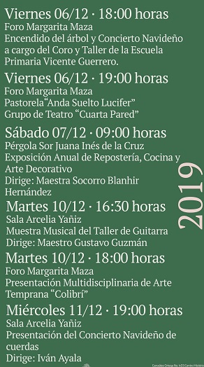 | 6:00 A 7:00 PM | Foro Margarita Maza | Concierto Navideño y encendido del árbol navideño. |