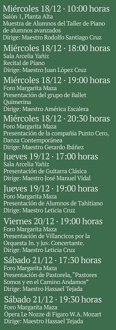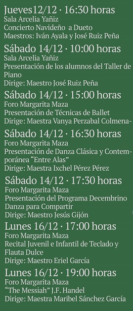 | 4:30 PM | Sala Arcelia Yañiz | Concierto Navideño a dueto |