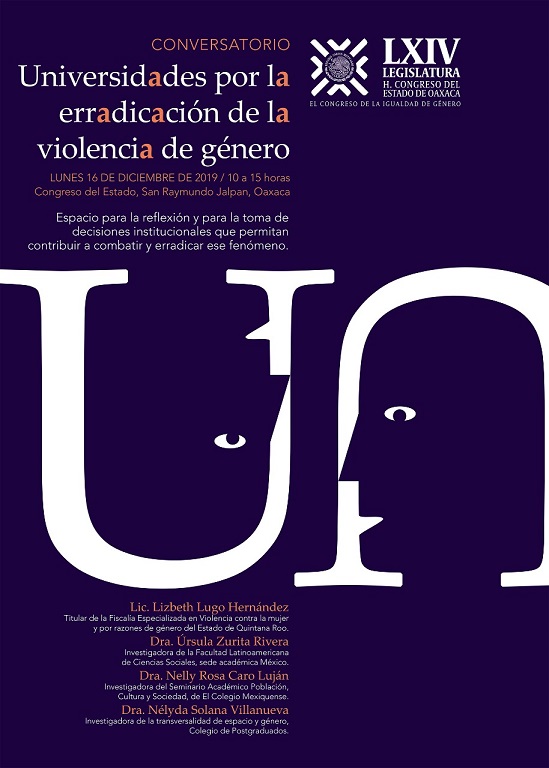 San Raymundo Jalpan, Oaxaca, Viernes 13 de Diciembre, 2019 (Fuente: Comunicado).- Con el objetivo de identificar medidas y espacios de intervención institucional de las universidades públicas y privadas del estado de Oaxaca, para la erradicación de la violencia contra las mujeres, tanto al interior de las universidades como hacia el resto de la sociedad, el Congreso del Estado realizará este lunes 16 de diciembre el conversatorio, Universidades por la erradicación de la violencia de género.