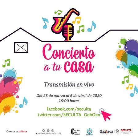 Oaxaca, Oaxaca, Domingo 22 de Marzo, 2020 (Fuente: Comunicado).- La secretaria de las Culturas y Artes, Karla Villacaña Quevedo anunció el proyecto “Concierto a tu casa”, con cantantes consagrados y populares de Oaxaca que de manera solidaria aportarán gratuitamente su talento para que la ciudadanía lo disfrute desde la comodidad de su domicilio, sin tener que exponerse al contagio.