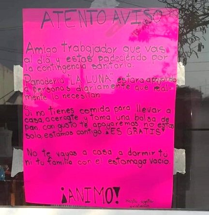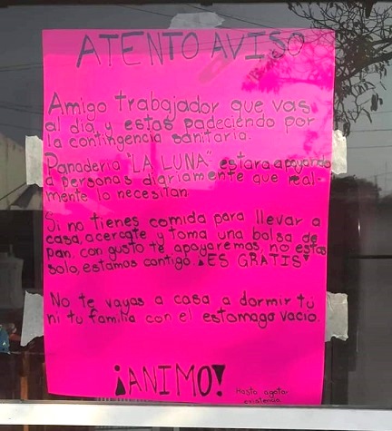 “Si no tienes comida para llevar a tu casa, acércate y toma una bolsa de pan, con gusto te apoyaremos, no estás solo, estamos contigo. ¡ES GRATIS!
