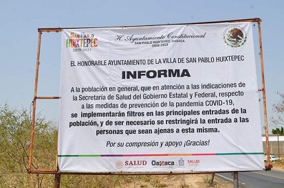 Oaxaca, Oaxaca, Miércoles 22 de Abril, 2020.- El Honorable Ayuntamiento Municipal de la Villa de San Pablo Huixtepec, del distrito de Zimatlán, en la región Valles Centrales de Oaxaca, informó a la comunidad en general que, como ya lo habían dado a conocer en días anteriores, ya se están colocando los filtros de seguridad en las diversas entradas de la población.