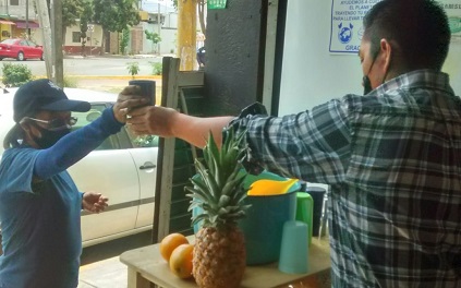 Así, Roberto Carlos Águilas Hernández y su compañera Anahí Simón García, preparan agua de fruta natural, y les comparten a los agentes de Vitalidad y Policía comisionados en el filtro ubicado en avenida ferrocarril a poca distancia de subir al paso a desnivel en 5 Señores, en esta capital.