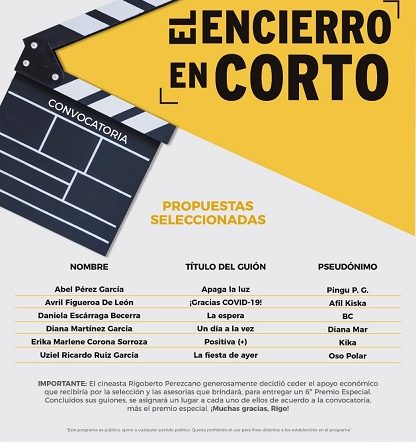 Los seis ganadores de la Convocatoria “El encierro en corto” son: Abel Pérez García (Pingu P. G.) con su guion: “Apaga la Luz”; Avril Figueroa de León (Afil Kiska) con: “¡Gracias Covid-19!”; Daniela Escárraga Becerra (BC) con “La Espera”; Diana Martínez García (Diana Mar) con “Un día a la vez”; Erika Marlene Corona Sorroza (Kika) con “Positiva (+)” y Uziel Ricardo Ruiz García (Oso Polar) con “La Fiesta de Ayer”.