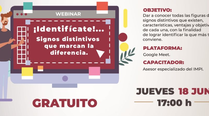 La titular de Economía indicó que el curso “¡Identifícate!… Signos distintivos que marcan la diferencia” será impartido por asesores especializados del Instituto Mexicano de la Propiedad Industrial (IMPI), el cual se llevará a cabo el próximo jueves 18 de junio en un horario de 17:00 a 18:00 horas y está dirigido a emprendedoras y emprendedores, dueños de negocios y a la ciudadanía en general; la capacitación cuenta con un cupo limitado a 50 participantes.