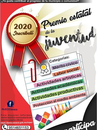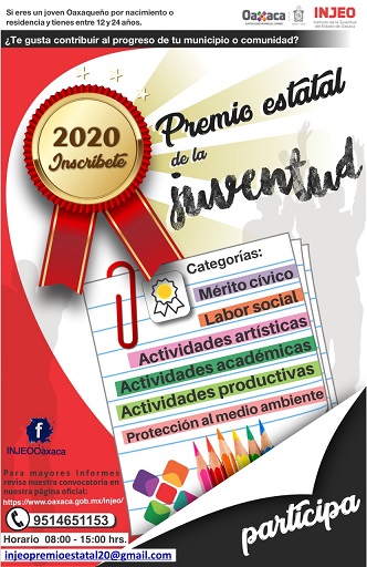 Para mayor información podrán consultar las bases de participación en el sitio https://www.oaxaca.gob.mx/injeo/convocatoria-premio-estatal-de-la-juventud-2020/.