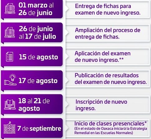 De acuerdo con el calendario del proceso de nuevo ingreso a Escuelas Normales, la publicación de resultados del examen será el 17 de agosto, y del 18 al 21 del mismo mes el trámite de inscripción de nuevo ingreso y el siete de septiembre el inicio de clases, que será presencial siempre y cuando el estado y los municipios donde se ubiquen las instituciones, se encuentren en semáforo verde.