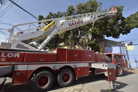 *Con estrictas medidas de seguridad, diversas áreas del Gobierno citadino iniciaron los trabajos con el apoyo del Heroico Cuerpo de Bomberos de Oaxaca para derribar el ejemplar ubicado en la calzada Madero