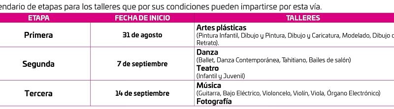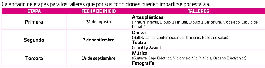 En ese sentido, el director general de la Casa de la Cultura Oaxaqueña, Emilio de Leo Blanco, dijo que, para garantizar una buena atención, se establecieron etapas de inicio para los talleres, que por sus condiciones pueden impartirse por esta vía.