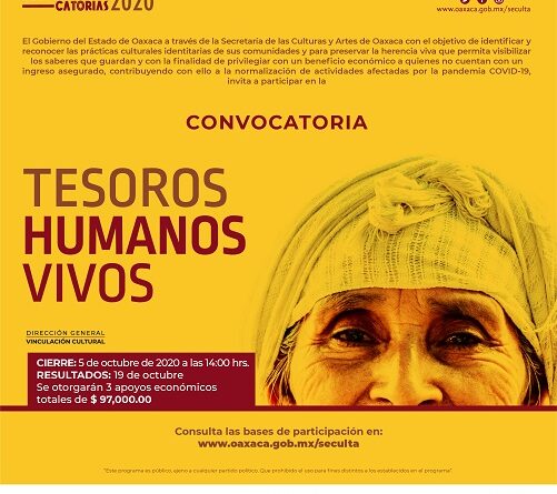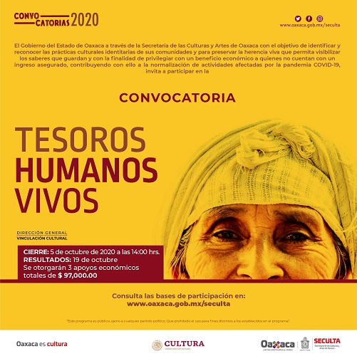 Oaxaca, Oaxaca, Martes 01 de Septiembre, 2020 (Fuente: Comunicado).- El gobierno del estado de Oaxaca, a través de la Secretaría de las Culturas y Artes de Oaxaca (SECULTA), con el objetivo de identificar y reconocer las prácticas culturales identitarias de sus comunidades y para preservar la herencia viva que permita visibilizar los saberes que guardan, presentó la convocatoria “Tesoros Humanos Vivos” que otorgará tres beneficios económicos de 97 mil pesos.