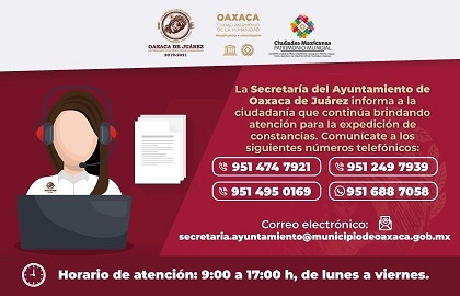 Oaxaca, Oaxaca, Miércoles 02 de Septiembre, 2020 (Fuente: Comunicado).- Para promover una atención a la ciudadanía de calidad, integral, personalizada y cercana, el Gobierno Municipal de Oaxaca de Juárez, a través de la Secretaría del Ayuntamiento, pone a disposición los teléfonos 951 474 7921, 951 495 0169, 951 249 7939 y 951 615 3922 (WhatsApp) para atender solicitudes de expedición de constancias.