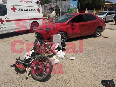En el cruce de las calles Constancia y avenida Del Trabajo del barrio Espinal, se suscitó un fuerte choque entre el comerciante de tortillas en motocicleta y los ocupantes de un vehículo, dejando como saldo una persona fallecida cuando recibía atención médica.