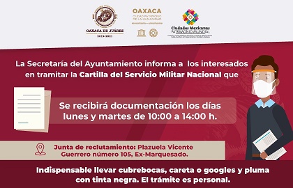 Oaxaca, Oaxaca, Viernes 11 de Septiembre, 2020 (Fuente: Comunicado).- Como parte de las actividades para estimular el cumplimiento de los deberes cívicos entre la ciudadanía, el Ayuntamiento de Oaxaca de Juárez, a través de la Junta Local de Reclutamiento del Servicio Militar Nacional (SMN) de la Secretaría del Ayuntamiento, invita a la juventud capitalina nacida en el año 2002 y remisos a tramitar la cartilla del Servicio Militar Nacional.
