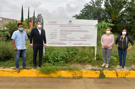 Oaxaca, Oaxaca, Jueves 17 de Septiembre, 2020 (Fuente: Comunicado).- Cumpliendo el compromiso de brindar una atención integral a todas las demarcaciones de Oaxaca de Juárez mediante acciones de desarrollo urbano que permitan elevar la calidad de vida de la ciudadanía, el Presidente Municipal Oswaldo García Jarquín, entregó la obra de construcción de pavimento con concreto hidráulico en la calle Sauces, de la colonia Reforestación, en la agencia municipal de Pueblo Nuevo.