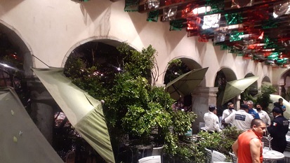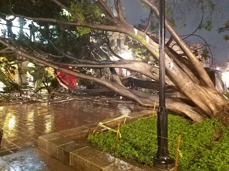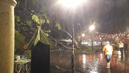 Oaxaca, Oaxaca, Viernes 18 de Septiembre, 2020 (Fuente: Agencias).- En la capital de Oaxaca, una fuerte tormenta causó este jueves la caída de un árbol de diez metros de altura en inmediaciones del zócalo citadino, cayendo en inmediaciones de uno de los restaurantes ubicados en los portales, reportándose un saldo de una personas herida.