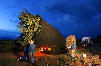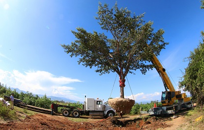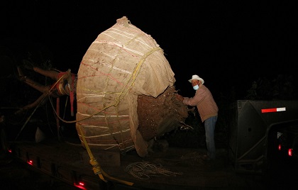 Fue emocionante que otras personas quisieran unirse a esta iniciativa. Así, los habitantes de la población, los muchachos de RootStudio y la brigada de la FAHHO, hicieron un banqueo alrededor del árbol que les permitiera formar el cepellón, desinfectar y estimular las raíces para evitar su estrés. La idea era subir el árbol a una grúa de 13 toneladas que se encargaría de trasladarlo a la ciudad. No se pudo, así que se requirió una máquina de 20 toneladas que levantó los 14 mil kilos del árbol para recostarlo sobre la plataforma. Aquel trabajo llevó varios días y noches de trabajo. El majestuoso ejemplar salió del paraje con los últimos rayos del sol, sobre una enorme plataforma metálica que serpenteó los angostos caminos de terracería.