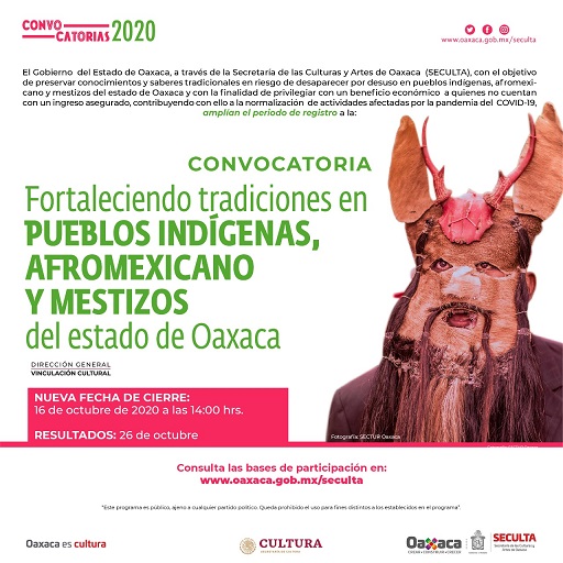 Por otra parte, la convocatoria “Fortaleciendo tradiciones de los pueblos indígenas, afromexicano y mestizos del estado de Oaxaca” que aportará 50 apoyos económicos de 20 mil pesos cada uno, tendrá como nueva fecha de cierre el 16 de octubre a las 14:00 horas, anunciando los resultados el 26 de octubre y la entrega de apoyos se llevará a cabo el 10 de noviembre.