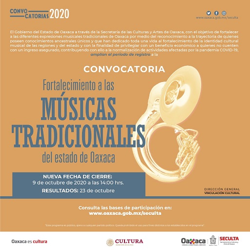 Oaxaca, Oaxaca, Viernes 02 de Octubre, 2020 (Fuente: Comunicado).- El gobierno del estado, a través de la Secretaría de las Culturas y Artes de Oaxaca (SECULTA), anunció la prórroga para la fecha de cierre de las convocatorias “Fortalecimiento a las músicas tradicionales del estado de Oaxaca” y “Fortaleciendo tradiciones de los pueblos indígenas, afromexicano y mestizos del estado de Oaxaca”, encaminadas a la reactivación económica del sector artístico y cultural de la entidad.