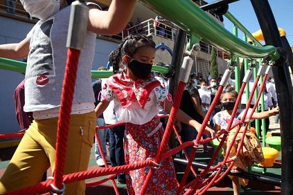 San Ildefonso Villa Alta, Villa Alta, Oaxaca, Viernes 16 de Octubre, 2020 (Fuente: Comunicado).- Para seguir construyendo las condiciones que permitan el adecuado crecimiento de la niñez oaxaqueña, la presidenta honoraria del Sistema para el Desarrollo Integral de la Familia (DIF) del Estado de Oaxaca, Ivette Morán de Murat, se trasladó a San Ildefonso Villa Alta, para entregar un parque incluyente con juegos infantiles, así como un módulo digital, a nombre del gobernador Alejandro Murat Hinojosa.
