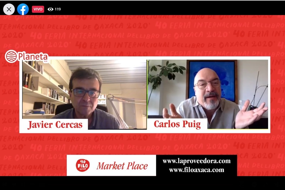 Oaxaca, Oaxaca, Sábado 24 de Octubre, 2020.- Con su obra traducida a más de 30 idiomas, el escritor español Javier Cercas participó en la 40 Feria Internacional del Libro de Oaxaca (FILO), donde conversó sobre su libro Tierra Alta y obra en general con el periodista Carlos Puig.