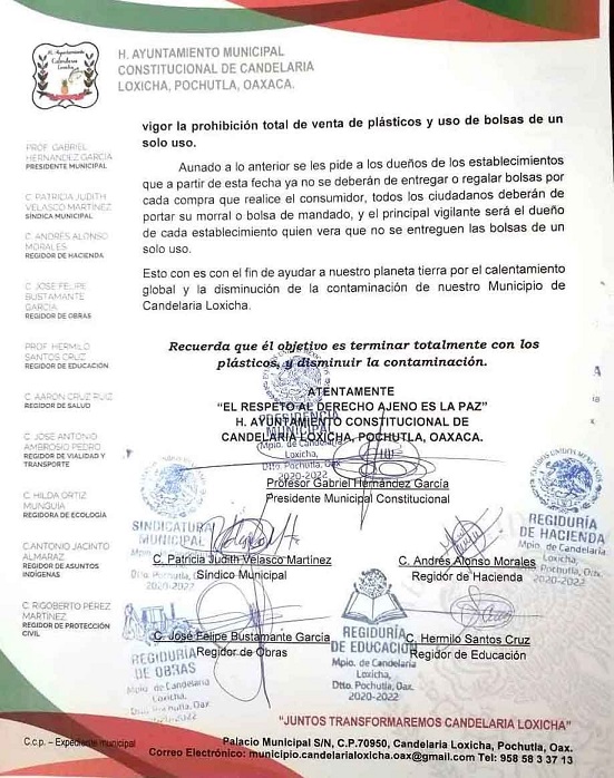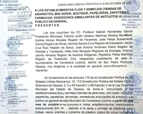 Candelaria Loxicha, Pochutla, Oaxaca, Domingo 25 de Octubre, 2020 (Fuente: Agencias).- El gobierno municipal de Candelaria Loxicha, del distrito de Pochutla, región Costa del estado, que preside el profesor Gabriel Hernández García, emitió un comunicado a los dueños de establecimientos comerciales fijos y semifijos, incluyendo tiendas de abarrotes, mini super, boutiques, papelerías, zapaterías, farmacias, vendedores de antojitos, así como al público en general para que a partir de este mes y hasta el 31 de diciembre del 2020, terminen con materiales desechables como son bolsas y cubiertos de plástico, popotes, platos y vasos de unicel, toda vez que a partir del primero de enero de 2020 entrará en vigor la prohibición total de venta de dichos materiales.