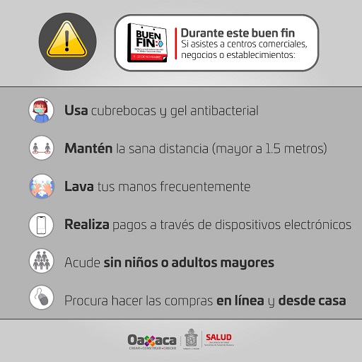 Agregó que es importante el uso correcto del cubrebocas que abarque de la nariz a la barbilla, mantener la sana distancia (mayor a 1.5 metros), lavar las manos frecuentemente, realizar pagos a través de dispositivos electrónicos, identificar previamente lo que se desea adquirir para evitar la permanencia por largos períodos de tiempo en los establecimientos y preferentemente acudir sin niños o personas adultas mayores, y que acuda una sola persona a realizar las compras.