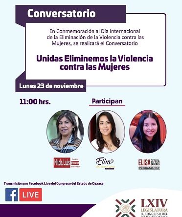 Organizado por la Coordinadora del Grupo Parlamentario de Mujeres Independientes, Elim Antonio Aquino, en el marco de la conmemoración del Día Internacional de la Eliminación de la Violencia Contra las Mujeres, la disertación tendrá lugar este lunes 23 de noviembre a las 11 de la mañana, mediante las plataformas digitales oficiales del Poder Legislativo. https://www.facebook.com/CongresoDelEstadoDeOaxaca/.