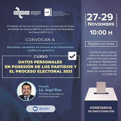 Oaxaca, Oaxaca, Jueves 26 de Noviembre, 2020 (Fuente: Comunicado).- El Instituto de Acceso a la Información Pública y Protección de Datos Personales del Estado de Oaxaca (IAIPO) en coordinación con la Asociación de Periodistas de Oaxaca (APO A.C.) convocan al curso virtual “Datos Personales en Posesión de los Partidos y el Proceso Electoral 2021”.
