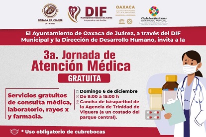 Oaxaca, Oaxaca, Sábado 05 de Diciembre, 2020 (Fuente: Comunicado).- Con el objetivo de brindar asistencia médica gratuita a los grupos vulnerables de la ciudad capital que se han visto limitados en el cuidado de su salud ante la pandemia de COVID-19, el Ayuntamiento de Oaxaca de Juárez, a través del DIF Municipal y la Dirección de Desarrollo Humano, invita a la ciudadanía a la Tercera Jornada de Atención Médica Gratuita, a realizarse el próximo domingo 6 de diciembre en la agencia municipal de Trinidad de Viguera.