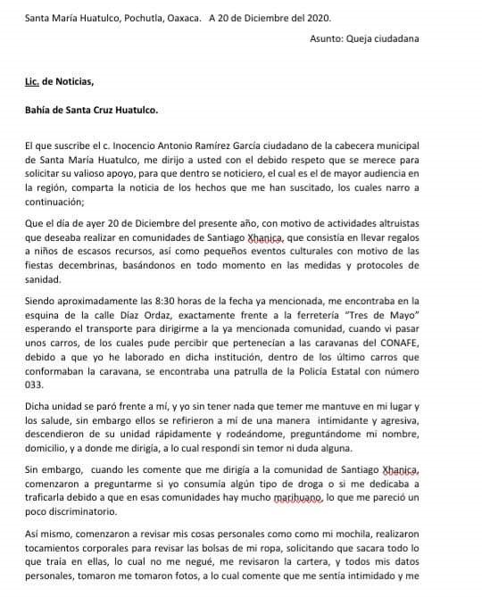 Oaxaca, Oaxaca, Miércoles 23 de Diciembre, 2020 (Fuente: Adub Santos).- Antonio Ramírez García es un joven de Santa María Huatulco (del distrito de Pochutla, región Costa de Oaxaca), quien la mañana del pasado domingo se dirigía a Santiago Xanica (del distrito de Miahuatlán, región Sierra Sur de Oaxaca), para regalar juguetes a los niños de esa comunidad, recolectados mediante una pequeña asociación, pero mientras esperaba transporte en inmediaciones de Huatulco (del distrito de Pochutla, región Costa), fue hostigado por elementos de la Policía Estatal comisionados en Huatulco.
