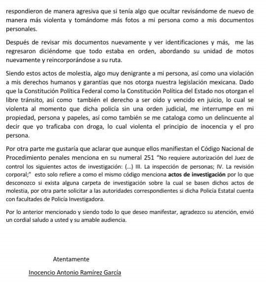 “Toño” relata, mediante un documento con el que levantó la denuncia correspondiente ante Derechos Humanos, y pidiendo voz en una estación de radio local, las acciones agresivas, prepotentes y fuera de orden que los elementos de la patrulla 033 realizaron a su persona, dentro de las cuales, comenta, al escuchar que su destino era Xanica, comenzaron a intimidarlo y señalarlo como traficante, ya que, según y en palabras de uno de los elementos, “en esa zona hay mucho mariguano”.