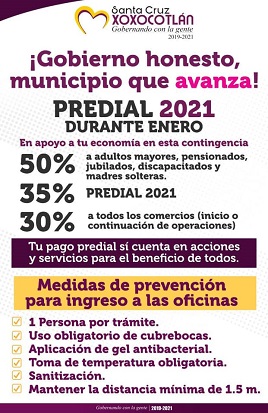 Santa Cruz Xoxocotlán, Oaxaca, Lunes 04 de Enero, 2021 (Fuente: Comunicado).- En apoyo a la economía de familias xoxeñas en esta contingencia, el Gobierno Municipal de Santa Cruz Xoxocotlán que encabeza el edil Alejandro López Jarquín, otorga durante el mes de enero a la población descuentos de hasta el 50 por ciento en el cobro de pago predial 2021 y 30% en la continuación de operaciones comerciales.