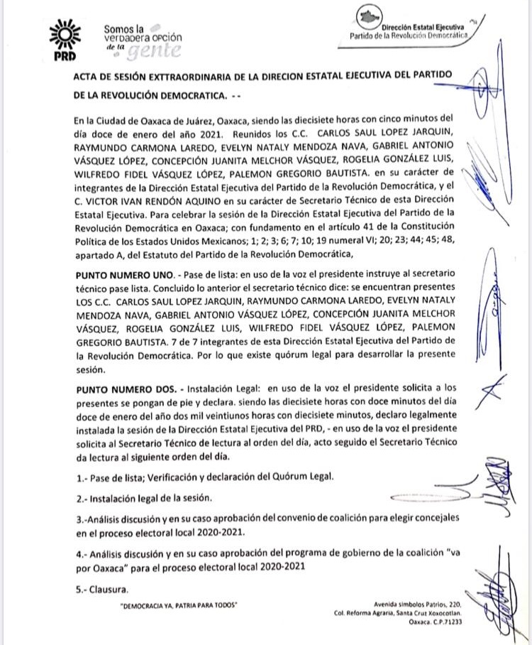 Oaxaca, Oaxaca, Miércoles 13 de Enero, 2021 (Fuente: Comunicado).- En sesión de la Dirección Estatal Ejecutiva (DEE) del PRD Oaxaca encabezada por el presidente del Sol Azteca en el estado, Carlos López Jarquín, secretarios de las diversas expresiones perredistas llevaron a consenso las posibles alianzas de cara a los próximos comicios electorales.
