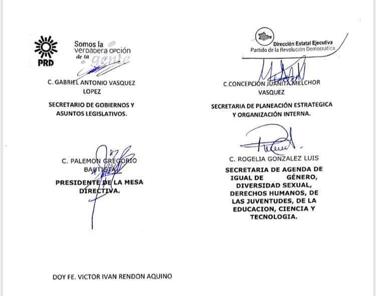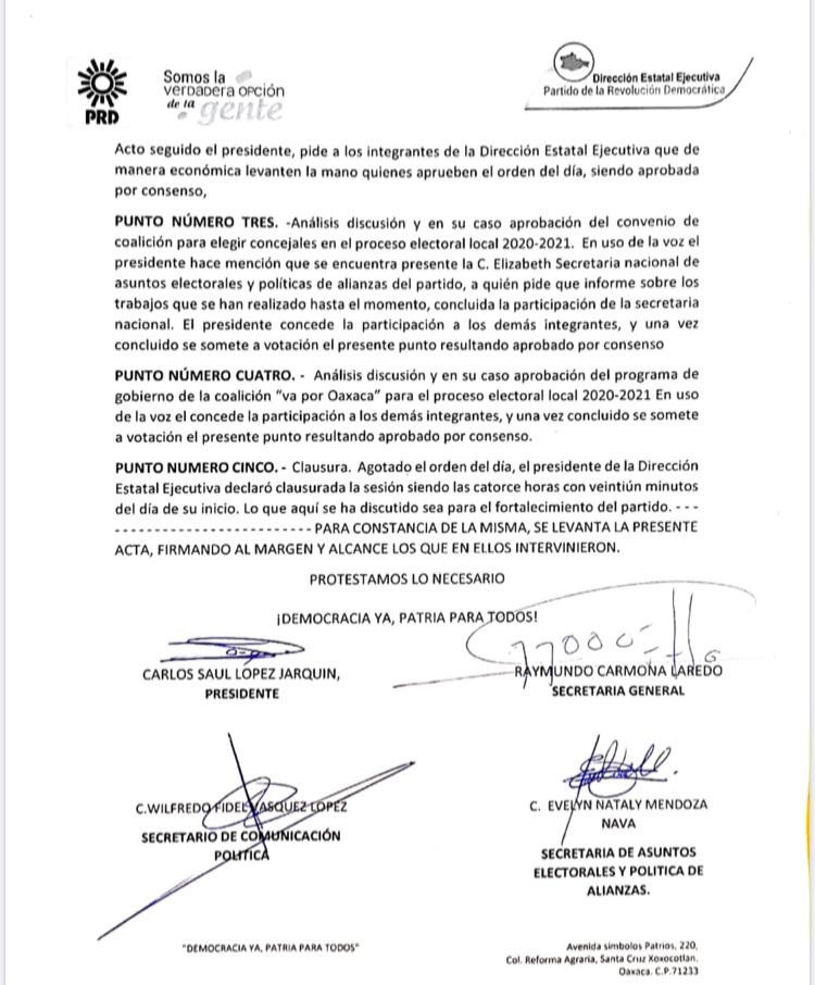 En ese sentido, el presidente del PRD Oaxaca, Carlos López Jarquín dijo que en dicho consenso participaron, Raymundo Carmona Laredo, Evelyn Nataly , Gabriel Vásquez, Concepción Melchor Vázquez , Rogelia González Luis, Wilfredo Fidel Vásquez López y Palemón Gregorio Bautista, dirigentes de las 5 expresiones políticas nacionales del PRD: ADN, Nueva Izquierda, Foro Nuevo Sol, Galileos y Vanguardia Progresista