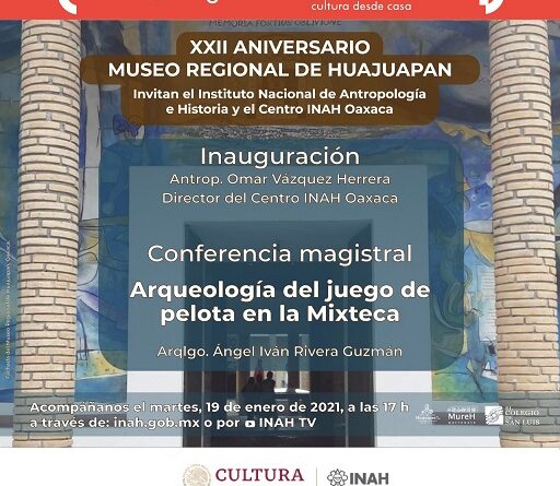 Oaxaca, Oaxaca, Martes 19 de Enero, 2021 (Fuente: Comunicado).- Del 19 al 23 de enero, se llevan a cabo las actividades por el XXII Aniversario del Museo Regional de Huajuapan (MUREH), en coordinación con el Instituto Nacional de Antropología e Historia (INAH) y el Colegio de San Luis, que debido a la pandemia derivada por el COVID-19, en este año serán de manera virtual.