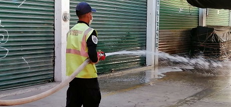 Bueno Velasco especificó que estas actividades se realizan de manera periódica y consisten en el saneamiento de lugares abiertos a través del uso de hidrolavadoras con soluciones a base de cloro y agua; se desinfectan aceras, áreas de espera, accesos y zonas de uso común, así como superficies de contacto como rejas, barandales, pasamanos y manijas de puertas.