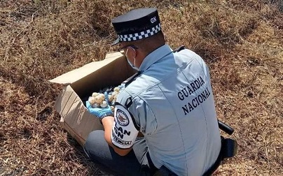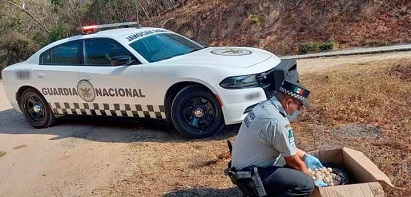 El aseguramiento se realizó en la entrada a la playa El Mojón, sobre la carretera nacional Pinotepa Nacional-Salina Cruz, federal 200, donde los efectivos federales detectaron a una persona que al notar la presencia de los guardias nacionales emprendió la huida y dejó abandonada una caja de cartón.