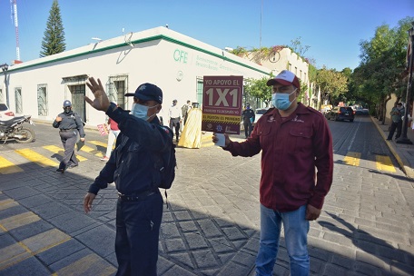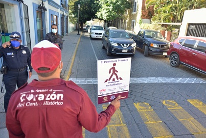 Oaxaca, Oaxaca, Sábado 13 de Febrero, 2021 (Fuente: Comunicado).- Con la premisa de promover una adecuada cultura vial que garantice la prioridad y respeto a las y los transeúntes de la ciudad, el Ayuntamiento de Oaxaca de Juárez, a través de la Dirección de Seguridad Pública, Vialidad y Protección Ciudadana y de la Coordinación Ejecutiva del Centro Histórico, puso en marcha la estrategia “El Peatón es Primero” en diversas intersecciones del primer cuadrante de la capital oaxaqueña.