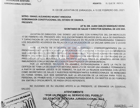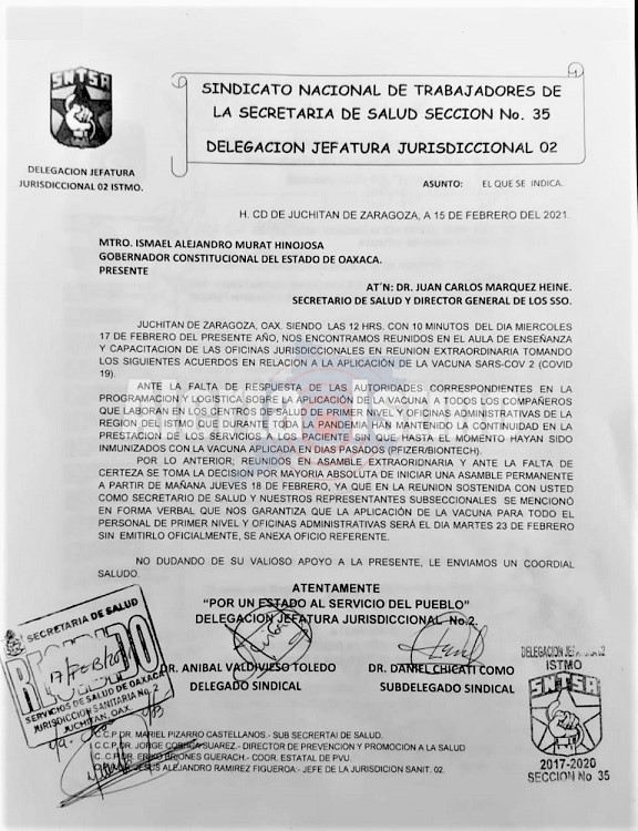 Oaxaca, Oaxaca, Jueves 18 de Febrero, 2021 (Fuente: Agencias).- El Sindicato Nacional de Trabajadores de la Secretaría Salud Sección 35, ante la falta de certeza a sus peticiones de la aplicación de vacunas contra el Coronavirus a todo el personal del primer nivel de atención y oficinas administrativas de la región del Istmo de Oaxaca, por ser personal de primera línea en contacto con pacientes, iniciarán a partir de este jueves 18 de febrero, una asamblea permanente en la delegación de la Jurisdicción Sanitaria número 2 con sede en Juchitán.