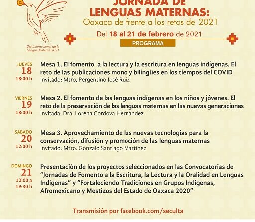 Oaxaca, Oaxaca, Viernes 19 de Febrero, 2021 (Fuente: Comunicado).- En el marco del Día Internacional de la Lengua Materna 2021, la Secretaría de las Culturas y Artes de Oaxaca (SECULTA) lleva a cabo la Jornada de Lenguas Maternas: Oaxaca frente a los retos de 2021 con diversas actividades que serán transmitidas a través de su página de Facebook: https://www.facebook.com/seculta.