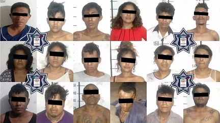 Por tal motivo, Cristian H. J de 19 años de edad, Josué Emanuel L. C. de 18 años, Antonio de Jesús M. G. de 36 años, Carlos S. R. de 30 años, Ottoniel Z. R. de 21 años, María de Lourdes R. de la R. de 50 años de edad, Zaira Sarahí P. V. de 30 años, José Gabriel M. L. de 28 años, Miguel Ángel R. G. de 21 años, Jairo Gamaliel A. G. de 32 años, Víctor H. V. de 28 años, Alexis R. R. de 29 años, Airam P. T. De 26 años, Alexia Gabriela P. H. de 24 años, Jesús Eduardo L. B. de 20 años, Iliana T. M. de 25 años, Luis Enrique C. A. de 28 años y Jesús Iván M. R. de 26 años de edad, respectivamente, fueron asegurados y puestos a disposición de la autoridad municipal para determinar su situación jurídica, haciendo la invitación la policía municipal a los vecinos de realizar la denuncia ante la Fiscalía para continuar con las investigaciones correspondientes.