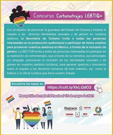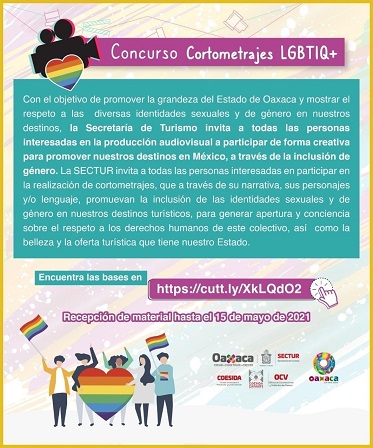 Oaxaca, Oaxaca, Miércoles 03 de Marzo, 2021 (Fuente: Comunicado).- Con la finalidad de promover la grandeza del estado de Oaxaca y mostrar el respeto a las diversas identidades sexuales y de género en los destinos de la entidad, la Secretaría de Turismo del Estado de Oaxaca (SECTUR Oaxaca) convoca al Concurso de Cortometrajes LGBTIQ+.