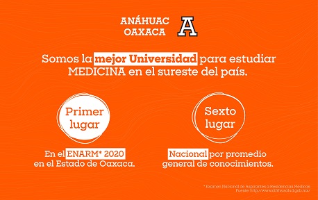 San Raymundo Jalpan, Oaxaca, Sábado 06 de Marzo, 2021 (Fuente: Comunicado).- De acuerdo a los resultados del Examen Nacional de Aspirantes a Residencias Médicas (ENARM) 2020, la Escuela de Medicina y Cirugía de la Universidad Anáhuac de Oaxaca (UAO) ocupa el primer lugar en el estado y sexto a nivel nacional por el promedio general de conocimientos obtenido por los Médicos Anáhuac evaluados.