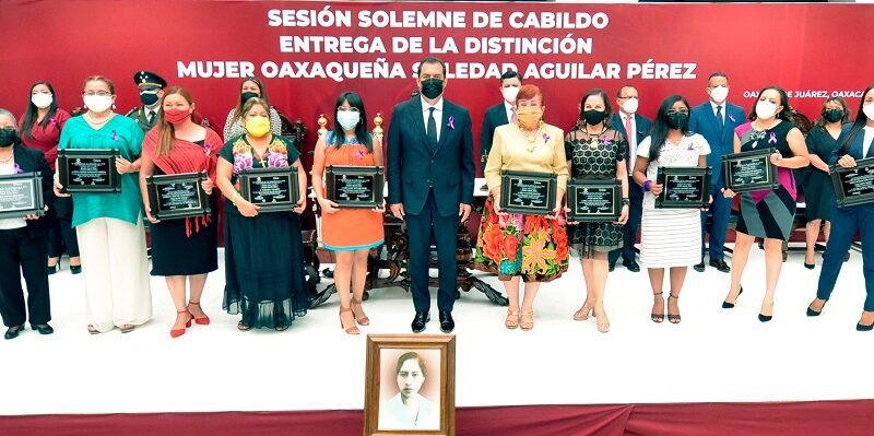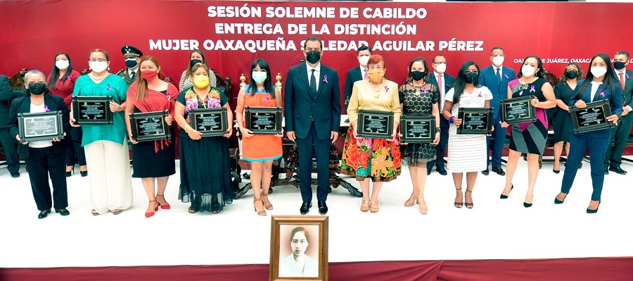Ahí, reconoció a las mujeres que recibieron la Distinción Mujer Oaxaqueña “Soledad Aguilar Pérez”, porque son ejemplo de liderazgo y vocación de servicio: Yatzi Maylet Ortiz Hernández, Nazaria Velasco, Margarita Teresa Solano Moreno, Sylvia Leonor Bustamante Arreola, Minerva Olivera Hernández, Raquel Martínez Martínez, Nelly Martínez Echartea, Stela María Fraginals Aguilar, Ana Lidia Barragán Barragán y Alma Rosa Nicolás García.