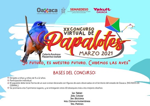 Dentro de la convocatoria, dirigida a la niñez de entre 5 y 12 años de edad, las y los participantes deberán elaborar un papalote temático de aves observadas en el territorio oaxaqueño (no aves de corral), con materiales reciclados (exceptuando el uso de plásticos).