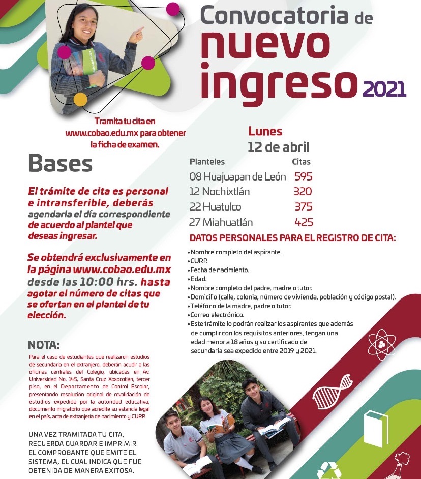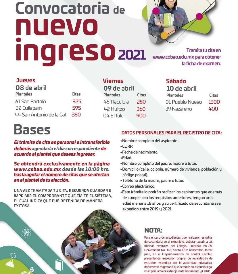 Oaxaca, Oaxaca, Miércoles 10 de Marzo, 2021 (Fuente: Comunicado).- El Colegio de Bachilleres del Estado de Oaxaca (COBAO), lanzó su convocatoria de nuevo ingreso para sus 68 planteles; ante la contingencia sanitaria, la entrega de citas y fichas será en línea, con el objetivo de salvaguardar la vida y la salud de las y los aspirantes.