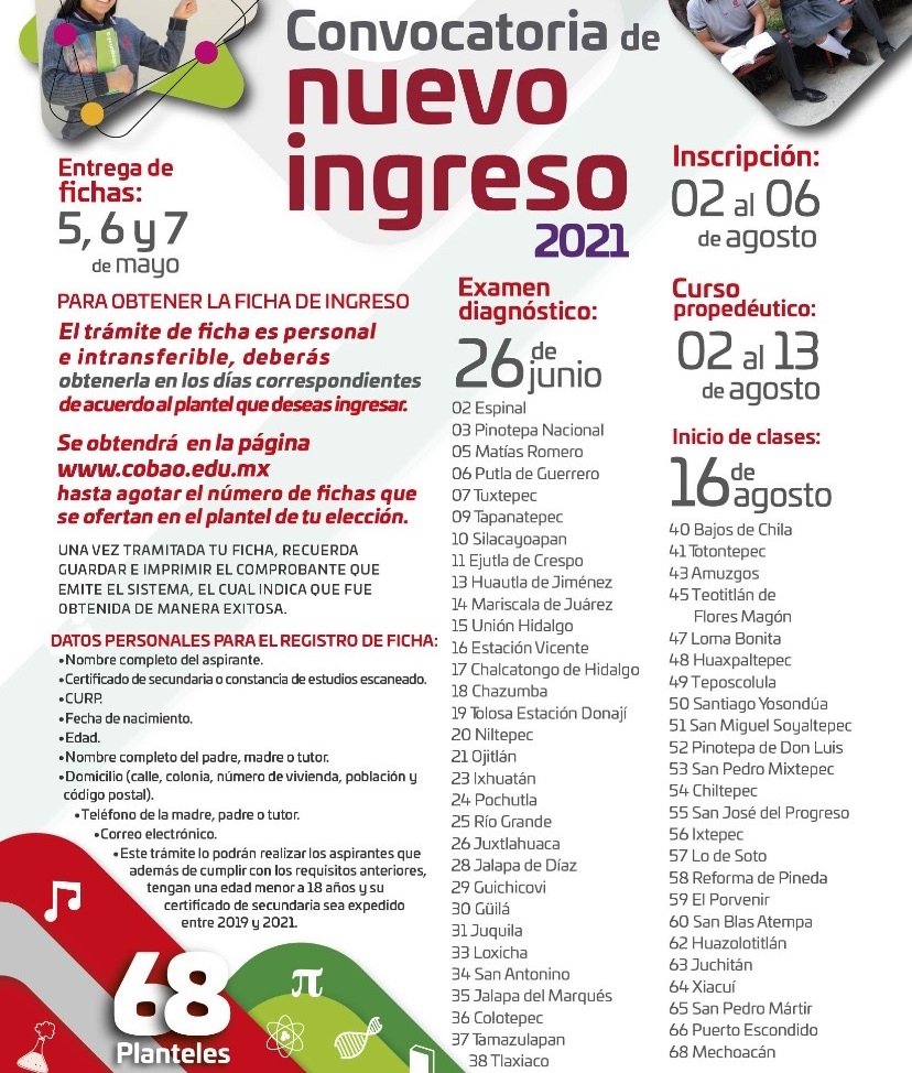 Por otra parte, del 5 al 7 de mayo en la página de internet www.cobao.edu.mx entregarán fichas en línea los siguientes planteles: 02 Espinal, 03 Pinotepa Nacional, 05 Matías Romero, 06 Putla de Guerrero, 07 Tuxtepec, 09 Tapanatepec, 10 Silacayoapan, 11 Ejutla de Crespo, 13 Huautla de Jiménez, 14 Mariscala de Juárez, 15 Unión Hidalgo, 16 Estación Vicente, 17 Chalcatongo de Hidalgo, 18 Chazumba, 19 Tolosa Estación Donají, 20 Niltepec.